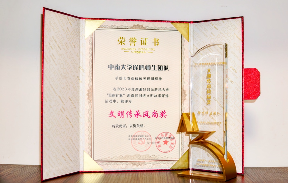 徐鸣副院长带领师生团队参加了此次活动,团队大众投票共计143743票,荣获“文明传承风尚奖”。湖南省委宣传部副部长、省委网信办主任刘学为团队颁发奖状奖杯。