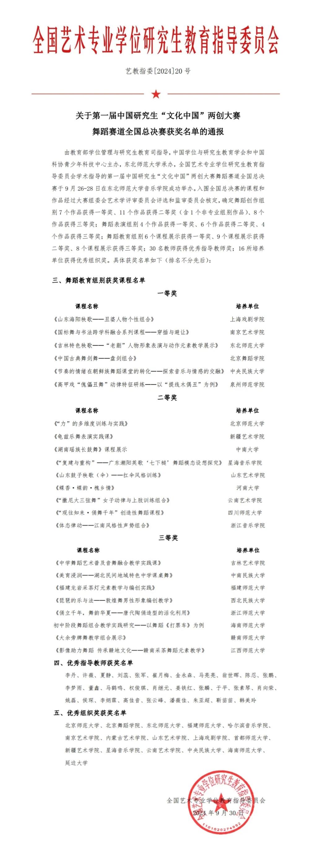 中国研究生“文化中国”两创大赛是中国研究生创新实践系列大赛主题赛事之一,是系列大赛中首个文科主题的创新实践公益性赛事。大赛由教育部学位管理与研究生教育司、全国艺术专业学位研究生教育指导委员会指导,中国学位与研究生教育学会和中国科协青少年科技中心主办,首届大赛舞蹈赛道由东北师范大学承办。据悉,初赛共有专业组62所培养单位报送的369个作品,经过初评共有83个舞蹈作品、45堂舞蹈教育课程展示入围全国总决赛,经决赛确定舞蹈创作组、舞蹈表演组、舞蹈教育组三类获奖名单。其中舞蹈教育组确定6名一等奖、9名二等奖、8名三等奖, 熟女
