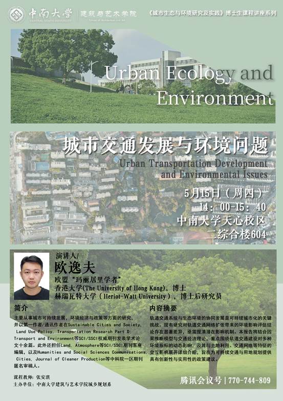 515日下午,熟女 《城市生态与环境研究及实践》博士生课程首场学术讲座在天心校区二综合楼604成功举办。本课程旨在通过国际学术交流与创新研讨,帮助博士生把握城市生态环境领域前沿动态,扩宽学生学术视野和创新能力。本次活动由课程负责人、城乡规划系张安琪讲师策划组织,特邀英国赫瑞瓦特大学"玛丽·居里"学者欧逸夫博士后作主题演讲。讲座以"城市交通发展与环境问题"为核心,城乡规划系博士新生及部分研究生参与研讨。