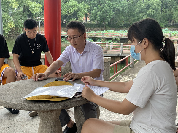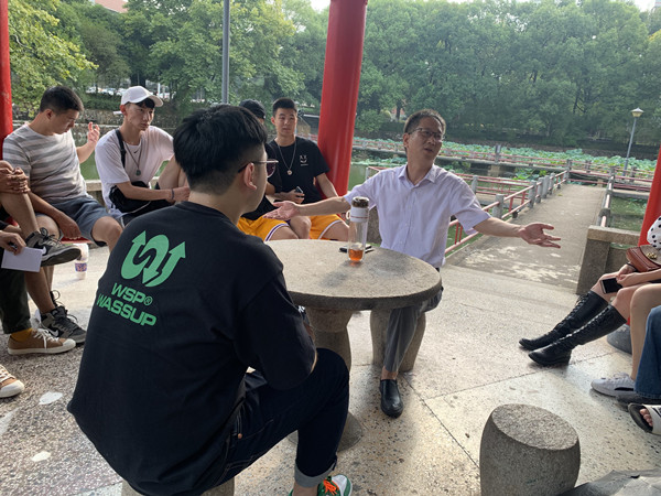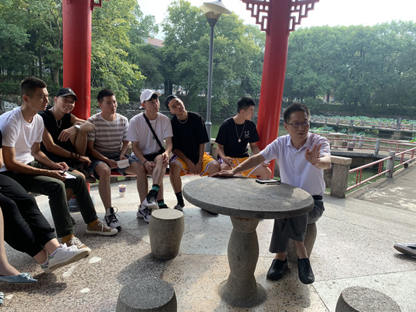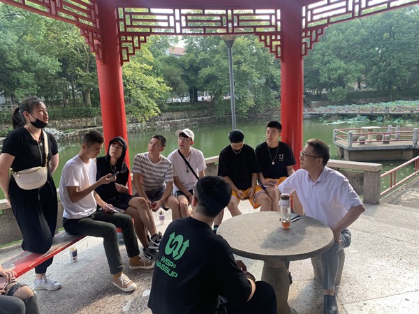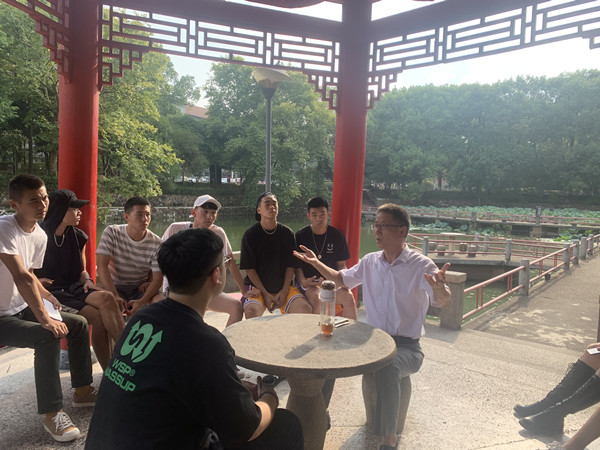 南校区荷花池小凉亭中,班导师张金学副书记与辅导员王斌老师同舞蹈表演1701班同学中召开新学期开学来第一次班会。