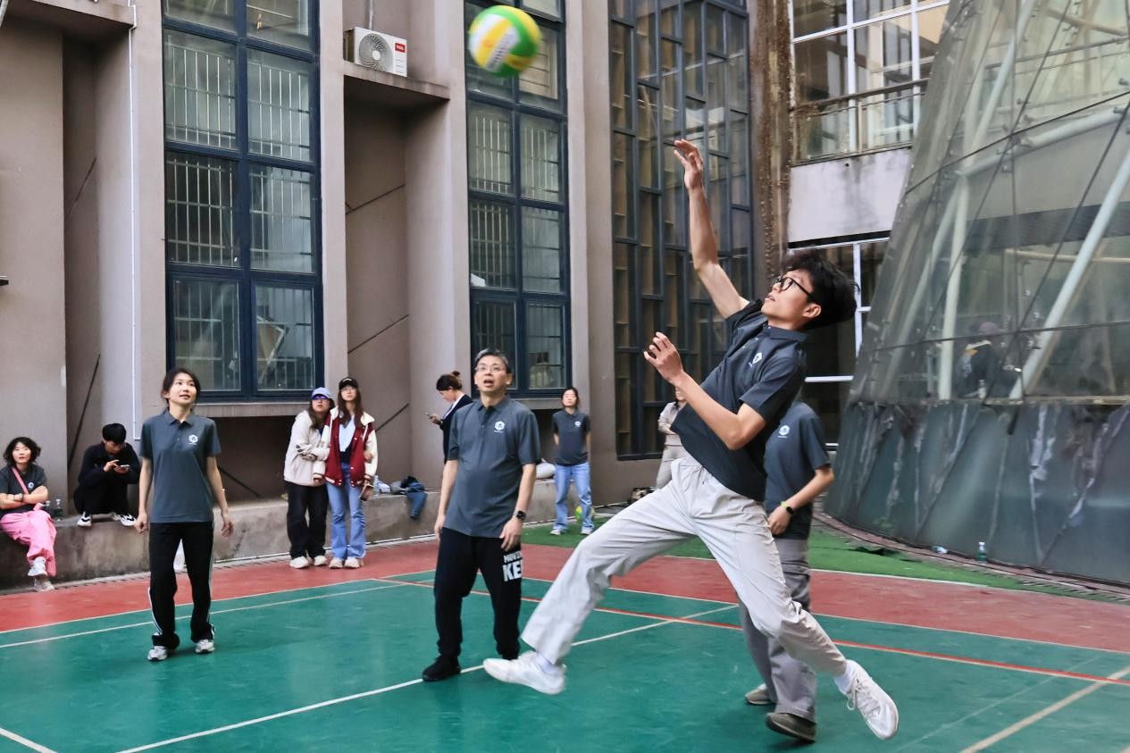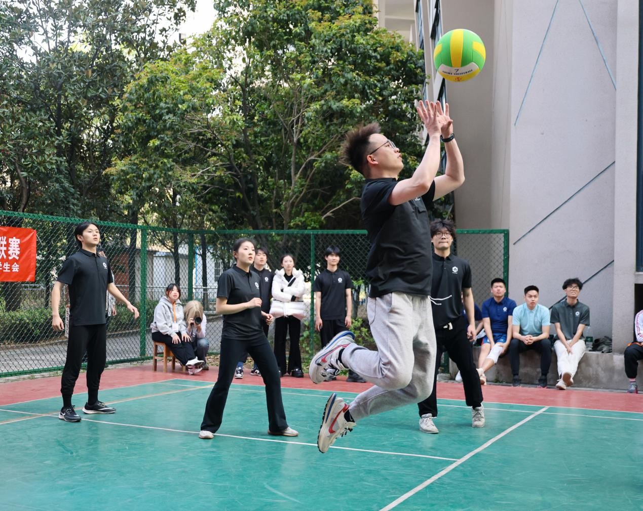 赛场上,师生们默契配合、攻防有度,将日常训练的扎实功底化作行云流水的技术动作。精准的二传为进攻架起桥梁,迅猛的扣杀引爆全场欢呼,每一次飞身救球的拼搏瞬间,都赢得观众席掌声雷动。随着比分交替上升,比赛进入白热化阶段,队员们额头的汗水折射着挑战自我、永不言弃的体育精神,而场下加油”“稳住的呐喊声,更凝聚着师生对健康生活的共同追求。