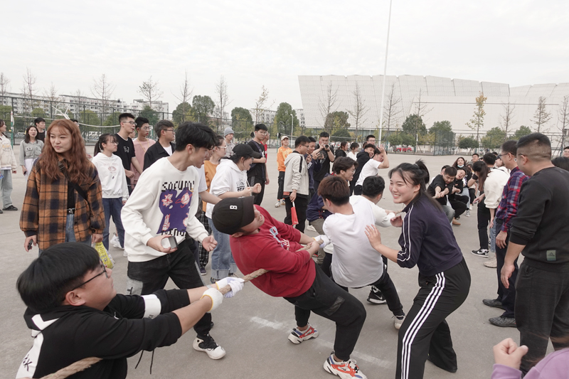 立冬已过,天气却和同学们的热情一样温度不减,当裁判口哨声吹响的那一刻,欢呼声,跺脚声,口号声融成一片。参加比赛的同学们精神饱满,斗志昂扬。双手一前一后,紧紧地攥住绳子,双脚分开,用力蹬着地,身体向后倾斜着。一边有节奏地高喊“一、二!一、二!”,一边共同用力拉绳子。队员们表情丰富多彩,让人忍俊不禁。张金学副书记一边传授着拔河要点,一边也不忘拍下同学们的精彩比赛。同学们还邀请了陈乐凯老师、赵世豪老师帮忙助阵,一旁的巫建辉老师还用水瓶奋力击打地面呐喊助威。比赛过程高潮迭起,精彩纷呈。