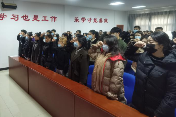 随后,张金学副书记向全体新发展党员表示祝贺,欢迎他们加入党的组织。他说入党宣誓是加入党组织的一个重要形式,这是党内政治生活的起点,因此他为全体同志提出三点要求:第一,认真学习党的基本理论。当下就是要把习近平新时代中国特色社会主义思想学懂、弄通、悟透,要掌握习近平总书记最新讲话精神,学习十九届五中全会精神,为接好社会主义现代化建设的接力棒、走好当代青年人生的长征路打好坚实的理论基础。第二,刻苦学习专业知识。广大同学将在十四五和二零三五远景规划目标实现的伟大进程中由旁观者变成参与者、组织者、决策者,只有明白自己的历史使命,才能在未来的工作中发挥作用、做出贡献,由此要珍惜在校生活,练就为人民服务的本领。第三,充分发挥先锋模范作用。在抗击疫情的伟大斗争中,党中央和各级党组织带领广大党员和全国各族人民为取得抗击新冠疫情人民战争、总体战、阻击战做出了艰辛的努力,所以党员同志要在党和人民需要的时候勇敢地站起来,在高校期间党员同志要带领全体同学认真学习文化课的知识、帮助有需要的同学健康成长顺利完成学业、积极开展批评和自我批评,引导和影响身边同学形成正确的世界观、人生观、价值观。他还为全体新发展党员佩戴党员工作牌,发放党建笔记本、U盘等学习用具,要求同志们践行誓言,在学生群体中亮明党员身份,做好表率,为党的事业不断奋斗。