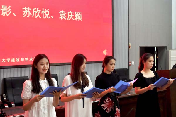 于建艺院113室举办“丹心建艺,礼献盛世”党史学习教育专题朗诵比赛。本次比赛由院学工办副主任巫建辉老师、辅导员李卉淼老师作为主审团参与评比。