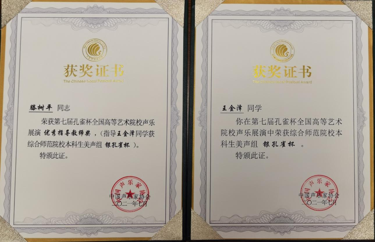 2021年7月22日至28日,“第七届孔雀奖全国高等艺术院校声乐大赛”在四川成都举行。本次大赛共有来自全国209所院校2171名选手参加,经过激烈角逐,我院音乐舞蹈系大三学生王金泽荣获综合师范院校(本科生)美声组“银孔雀”奖,专业导师滕树平副教授荣获“优秀指导教师奖”,熟女