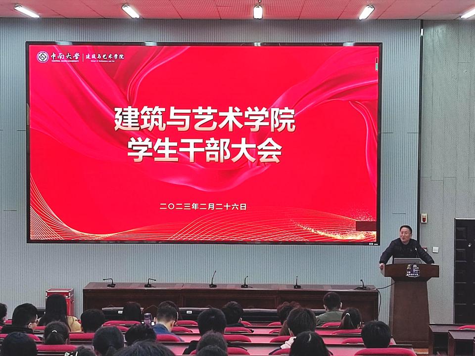 于2月26日下午三点在艺术楼113中南艺术讲堂召开了新学期第一次学生干部大会。本次会议由院团委书记强俊老师主持,本科生及研究生班长、院团委、学生会、研究生会、心助会等学生干部参会。