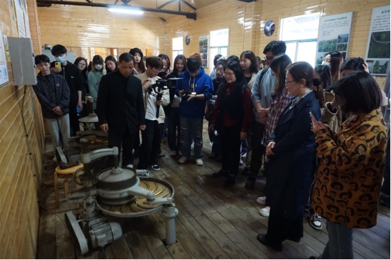 以金井茶业为代表的“长沙绿茶制作技艺”,是湖南省级非遗项目 。长沙县金井地区位于北纬29度线 ,有着悠久的制茶历史,现在金井山区还遗留一条始于唐代的茶马古道。长沙金井茶叶公司产量充裕,每年可产茶7000吨。通过与金井茶业的非遗代表人物和其他制茶艺人的讲解和沟通,师生进一步了解了传统和现代的制茶工艺。随后在工作人员的带领下进入茶山,体验茶旅融合的先进业态现状。