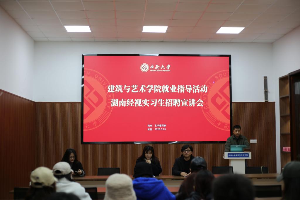 就业指导活动,湖南经视实习生招聘宣讲会于艺术楼四家活动室顺利举办。本次活动由湖南经视传媒有限公司(频道)人力资源部陈翼,湖南省舞台美术协会副会长何熊主讲,熟女