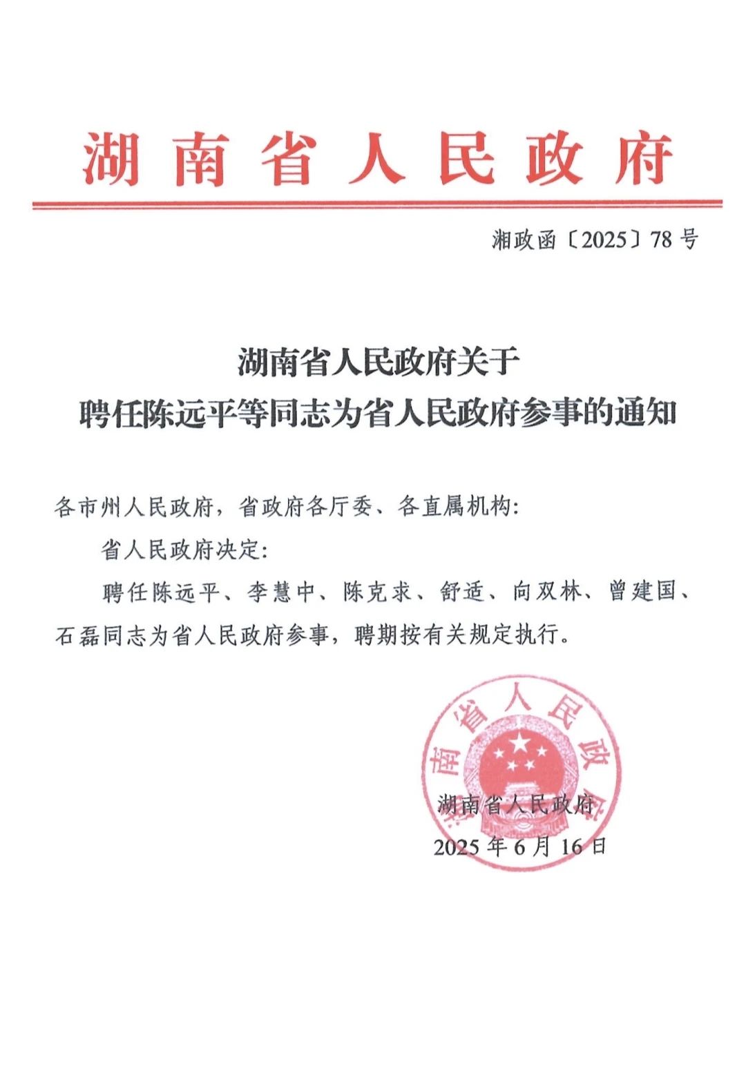 近日,湖南省人民政府发布《关于聘任陈远平等同志为省人民政府参事的通知》(湘政函〔2025〕78号)。 熟女 院长石磊教授获聘省政府参事。