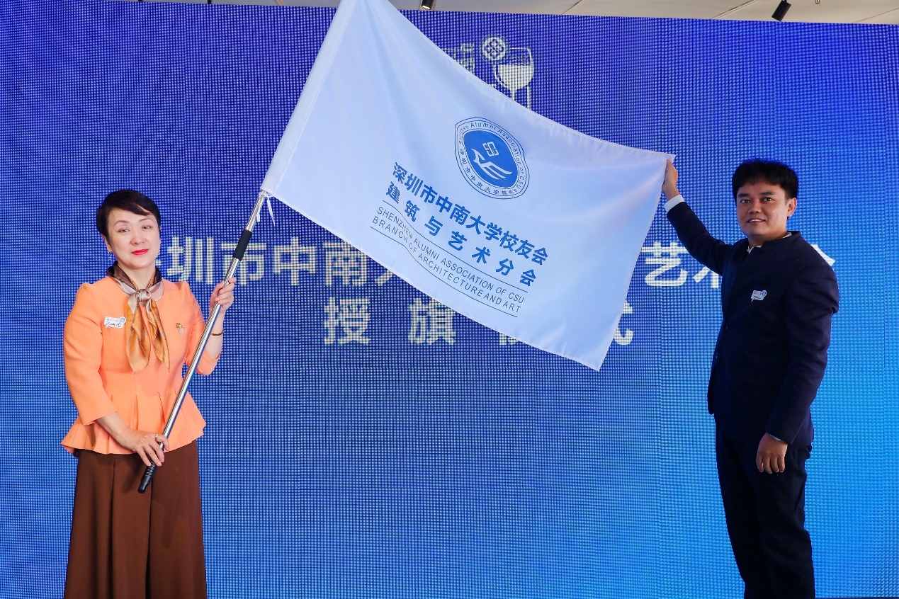 校友会执行会长汤伟玲为学院分会授旗。