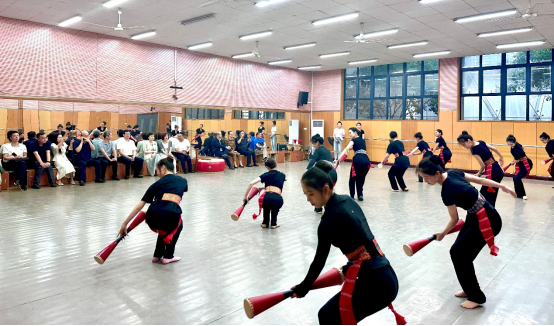 随后,李爱武厅长一行来到舞蹈排练厅观看了瑶族长鼓舞现场教学,伍彦谚老师介绍了江华瑶族长鼓舞文化传承基地发展和建设情况,对排练内容进行了细致讲解,李爱武充分肯定了学院在瑶族文化传承方面做的努力和取得的成效。